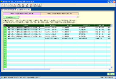 | ■作成した全ての安全書類を一括で保存します。保存先は標準領域、任意フォルダ(LAN接続先可)、外部メディア等を切替ボタンで選択できます。標準領域内の保存フォルダは専用画面を使って簡単に追加作成できます。保存フォルダを複数作成し安全書類の分別管理を行うことも可能です。 ■一括保存した安全書類は表画面形式で確認できますので保存後の検索が容易です。また、工事名称、会社名、作成日等のタイトル項目で並べ替え表示できます。 ■安全書類はファイル名を指定して単独で保存読込できます。ひな形的な書類を作成しておくことで次回からの作成作業を軽減できます。 ■メールやメディアでの提出に最適なPDF形式での出力も間単に行えます。 |