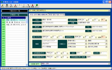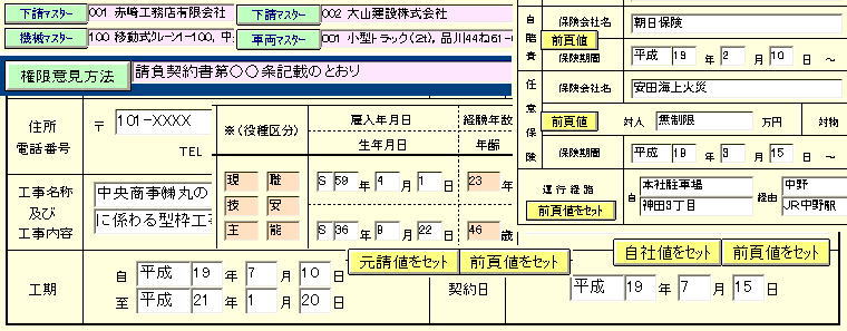 | ■マスターとして登録したデータは安全書類の作成時に一覧表示され、その書類に必要なほとんどの項目をセットします。また過去に作成した書類を読込み最新マスター値を再セットした書類を作成できます。 ■「建設業法雇用改善法等に基づく届出書」及び「施工体制台帳」の下請欄の工事名称・工事内容・工期、「移動式クレーン車両系建設機械等使用届」の持込年月日・搬出予定年月日・使用場所、「工事通勤用車両届」の保険項目・運行経路等の前ページと類似した内容となる項目は複写ボタンで部分コピーできます。 ■よく使う語句を登録しておき、入力時に一覧リストより選択入力できます。長文やよく使用する文字列を登録しておけば書類作成作業を軽減できます ■作業員の年齢や業務経験年数、新規入場時教育の所要時間等は自動計算されます。 ■元号はアルファベット1文字の入力を漢字に自動変換。元号は専用テーブルを活用することにより将来の改元時にもユーザー側で即対応できます。 |