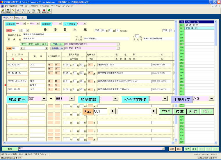 | ■安全書類はヘッド部、データ部別々のページ処理が行えます。例えば「建設業法雇用改善法等に基づく届出書」及び「施工体制台帳」は最大で自社(左)側10社×下請(右)側100社の登録が行えます。 ■上記書類や「移動式クレーン車両系建設機械等使用届」「持込機械等使用届」の印刷時はA3、A4サイズを選択できます。 ■「作業員名簿」や書類全体が1ページ分となる帳票では画面右側に表示される一覧画面で登録状況の確認作業がスピーディーに行えます。 ■データの追加や複写に備えて「空行」「複写」「削除」「挿入」ボタンが用意されています。印刷時のページ番号指定、有無等も選択できます。 ■「下請負業者編成表」や「工事作業所災害防止協議会兼施工体系図」等の項目が多めの帳票も複数会社をしっかり登録できます。 |