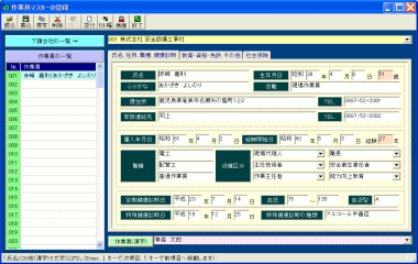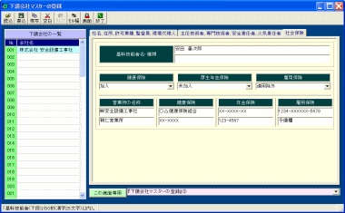 | ■上記法改正にマスターデータ登録処理も対応しました。元請会社マスター、下請会社マスター、作業員マスターに社会保険加入状況欄を追加しました。また、下請会社マスターには登録基幹技能者名及び技能種類欄も追加しました。 ■用語マスター欄にも社会保険項目を追加しています。 |