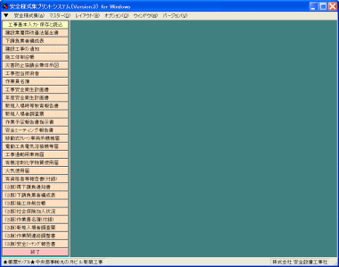 | ■安全書類の配置分けと種別を出来るだけ解り易く、選択処理が簡単に行えるよう大きめのカラーボタンメニューを採用しました。様式番号と書類名がより見分け易くなりました。 ■画面左端には主要な書類をワンタッチで表示できるダイレクトメニューボタンも表示できます。 ※上記イメージではWindowsXPの画面を縮小したため多少ボヤケていますが実際はシャキッと表示されます。また、文字フォントは任意に変更できWindowsVista以降主流のメイリオ体等での表示も行えます。 |