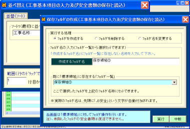 | ■作成した全ての安全書類を一括で保存します。保存先は標準領域、任意フォルダ(LAN接続先可)、外部メディア等を切替ボタンで選択できます。標準領域内の保存フォルダは専用画面を使って簡単に追加作成できます。保存フォルダを複数作成し安全書類の分別管理を行うことも可能です。 ■一括保存した安全書類は表画面形式で確認できますので保存後の検索が容易です。また、工事名称、会社名、作成日等のタイトル項目で並べ替え表示できます。 ■安全書類はファイル名を指定して単独で保存読込できます。ひな形的な書類を作成しておくことで次回からの作成作業を軽減できます。 ■メールやメディアでの提出に最適なPDF形式での出力も間単に行えます。 |