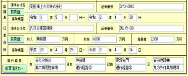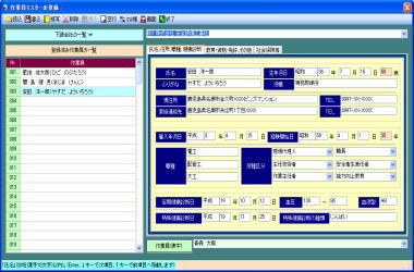 | ■マスターとして登録したデータは安全書類の作成時に一覧表示され、その書類に必要なほとんどの項目をセットします。また過去に作成した書類を読込み最新マスター値を再セットした書類を作成できます。 ■「建設業法雇用改善法等に基づく届出書」及び「施工体制台帳」の下請欄の工事名称・工事内容・工期、「移動式クレーン車両系建設機械等使用届」の持込年月日・搬出予定年月日・使用場所、「工事通勤用車両届」の保険項目・運行経路等の前ページと類似した内容となる項目は複写ボタンで部分コピーできます。 ■よく使う語句を登録しておき、入力時に一覧リストより選択入力できます。長文やよく使用する文字列を登録しておけば書類作成作業を軽減できます ■作業員の年齢や業務経験年数、新規入場時教育の所要時間等は自動計算されます。 ■元号はアルファベット1文字の入力を漢字に自動変換。元号は専用テーブルを活用することにより将来の改元時にもユーザー側で即対応できます。 |