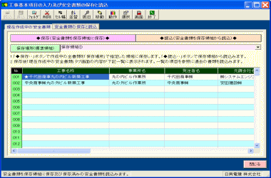 | ■作成した書類のプレビューと印刷は同じ画面内ですので内容の確認と訂正が素早く行えます。また画像タイプのPDFファイル形式で出力できますので提出先にメール等で提出できます。 ■作成した書類は全帳票一括での保存及び各帳票個別の保存が可能です。全帳票一括保存では工事名、会社名、工期等10種類以上の項目を一覧表示しますので保存ファイル名を意識することなく管理できます。 ■保存した安全書類は内部ディスク、外部ディスク、任意フォルダ間で任意に移動及び複写が行えます。 |