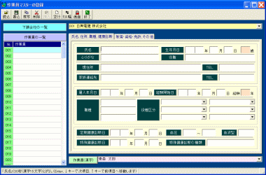 | ■マスターデータは書類作成作業を軽減するために必要なものです。当システムでは会社系マスター(発注、元請、下請)と下請会社名の配下として存在する項目系マスター(作業員、移動式クレーン車両系建設機械、電動工具電気溶接機、工事通勤用車両、有機溶剤特定化学物質)に分別することで管理と抽出を理解しやすくしています。 ■各マスターのアイテム数は書類作成を軽減させるべく、なるべく多くの項目を抽出しています。登録時点で不明な箇所や不要な箇所は省略できます。 ■マスター登録画面では入力作業はテキストボックス形式で行い、登録結果は一覧で表示していますので確認が容易です。 ■登録後でも複写、削除、挿入機能を使って順番の並び替えが簡単に行えます。 ■マスターデータは万が一のトラブルに備え、用途に応じて2種類のバックアップ機能を有しています。 |