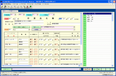 | ■入力画面は安全書類を参考に各部品を手作業で正確に配置しました。よって、ユーザーが少しでも使い易いように文字のサイズや罫線の太さ、背景等に気を配っています。(帳票画像を読込み貼り付けただけの入力画面を使用しているソフトとは格段に見易い画面構成になっています) ■書類を複数ページ作成する場合に各ページのタイトルになる項目(例えば会社名や機械名称)を赤文字表示していますので重要項目の場所と確認が容易です。 ■作業員名簿等では画面右側に登録作業員一覧を表示できますので、登録状況を簡単に確認でき登録後に修正を行う場合でも該当作業員の捜索が容易です。 ■処理ボタンや印刷設定パネル等は色分けしていますので処理の意味合いが把握し易くなっています。 ■背景色は好みやユーザー使用のモニターに合わせて調整できます。 |