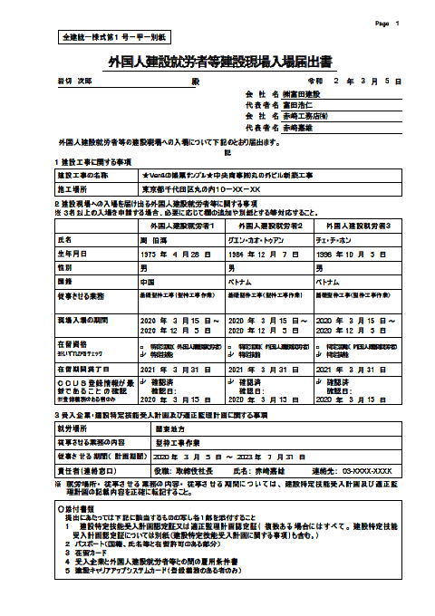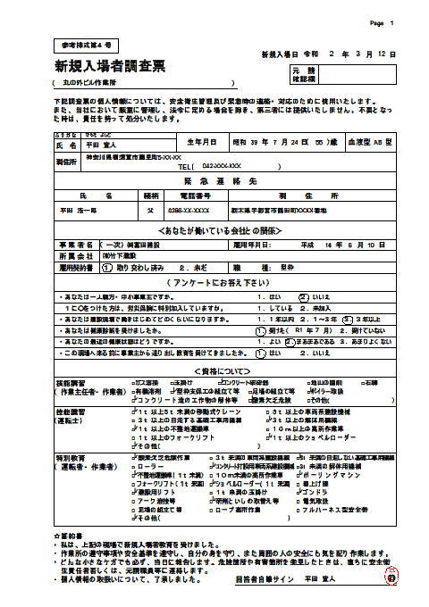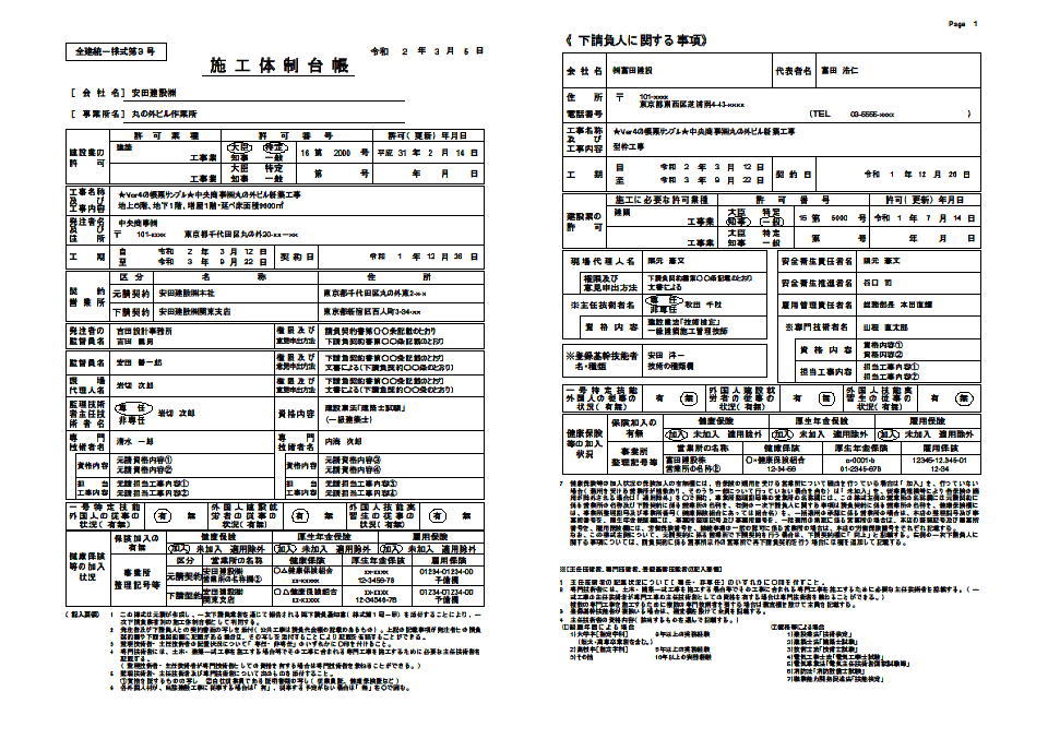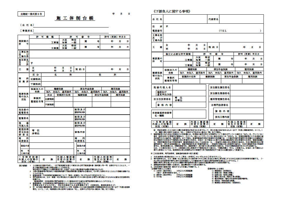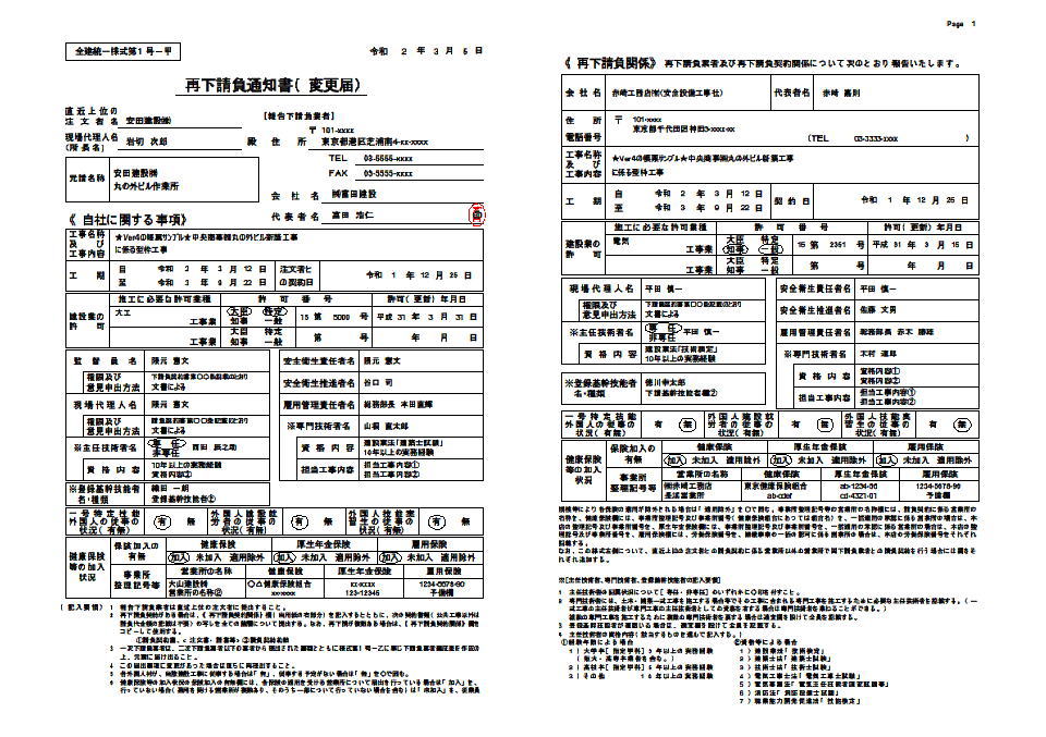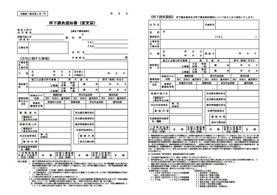 | 全建統一様式・改訂4版補訂版および 平成31年度(令和1年度)国土交通省推奨仕様参考の書類を紹介しています。 (一号特定技能外国人の従事の状況が追加されました。外国人建設就労者等建設現場入場届出書が新しくなりました。etc。) PDFで出力したものを掲載しています。実際の印刷物はメリハリがあり、遥かにきれいな仕上がりです。 全建統一様式で印鑑欄がある書類に関しては電子印鑑(画像)の出力を可能にしました。 |