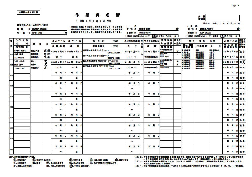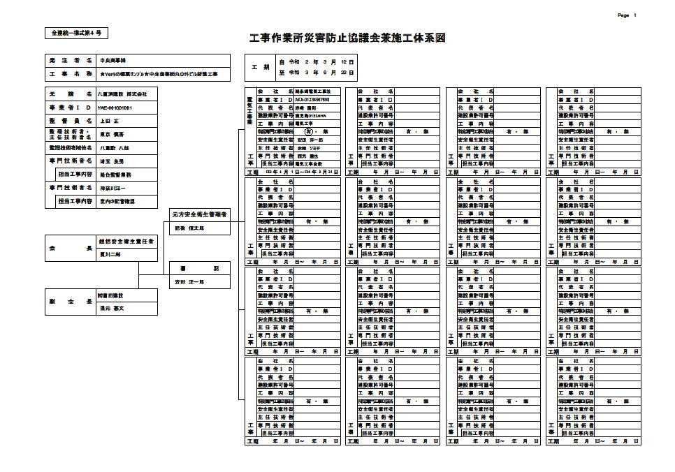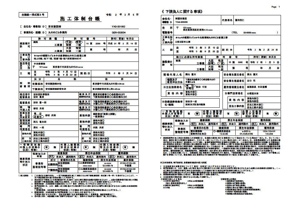 | ■安全様式集プリントシステム4は全建統一様式の新様式である改訂6版、改訂5版、改訂4版(補訂を含む)、改訂3版および改訂2版に対応した安全書類作成ソフトです。作成できる安全書類は以下のとおりです。作業員名簿、再下請負通知書、建設業法・雇用改善法等に基づく届出書(変更届)、下請負業者編成表、施工体制台帳作成建設工事の通知、施工体制台帳、社会保険加入状況、作業間連絡調整書、工事作業所災害防止協議会兼施工体系図、施工体制台帳(工事担当技術者)、施工体制台帳(監理(主任)技術者用名札)、工事安全衛生計画書、年度安全衛生計画書、新規入場時等教育実施報告書、新規入場者調査票、作業予定報告書指示書、安全ミーティング報告書、移動式クレーン車両系建設機械等使用届、持込機械等(電動工具電気溶接機等)使用届、持込機械届済証、持込機械届済証、工事通勤用車両届、有機溶剤特定化学物質等持込使用届、火気使用願、外国人建設就労者建設現場入場届出書、有資格者等報告書(付録)。 |