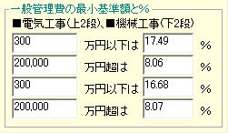 | ★「公共建築工事共通費積算基準・平成28年12月版」で一般管理費等率の係数が変更されました。2015年3月11日以降のバージョン(8.21)ではユーザー自身で係数の変更が行えます。必要であれば国土交通省のHPを参考に以下の手順で変更を行ってください。8.21以前のユーザー様で共通費の自動算出機能及びその他の修正版が必要なユーザー様はメールにて会社名等をご連絡下さい。 ■一般管理費等率の係数の変更方法 @見積書メニューから「経費と値引きの入力」画面を選択表示します。 A画面上部の「自動」ボタンをクリックし、「共通費の自動算出」画面を表示させます。 B画面上部の画面切替タブで「係数の設定」をクリックし同画面に切り替えます。 C右記画像に従い一般管理費の係数を変更して下さい。 |