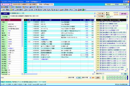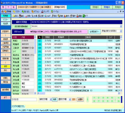 | ■操作機能■ ●初心者から熟練者までを考慮し3種類のメニューを用意。 ●見積書の作成処理を着色ボタンで処理順に配置したカラーメニュー、よく使う処理画面のボタンを常時表示させたダイレクトメニュー、画面最上部にはオーソドックスな処理ツールメニューを設置。 ★材料マスター(業種別に多様で豊富なデータを用意) ●材料マスターは5種類を構築可能。 ●材料マスター切替ボタンには民間用、官庁用、電気、機械等任意の文字列を設定可能。 ●内訳明細書の作成時は複数マスターからの挿入処理が可能。 ●積算実務形式、建設物価調査会、経済調査会、弊社提携先の実使用データなど多様な材料データの取込と活用が可能。 ★複合単価(豊富な計算式と構成項目を用意) ●電気工事業と管工事業及び設備工事業全般で必要な複数の計算式を用意。 ●複合単価を構成する項目も多数準備。 ●範囲や特定の材料区分を指定しての一括計算が可能。算出後の金額に応じた端数調整が可能。 ●複合単価の計算式と構成金額を列記した複合単価表(代価表)の出力が可能。 ★見積書、拾出表の保存(保存領域の簡単切替と履歴管理機能を搭載) ●保存領域を年度や提出先別に区分けしての保存処理が可能。 ●保存領域はハードディスク、外部メディア、LAN接続先等を素早く切替可能。 ●保存見積書を別領域に複写または移動する場合は専用画面を利用した簡単操作を実現。 ●任意項目での並べ替え処理が可能。 ●保存見積書一覧画面の任意行に金額の分類計行及び小計行の挿入が可能。期間及び提出先別等の合計金額を表示可能。 ★表画面の工夫(弊社オリジナルのダブル表画面がとっても便利) ●表画面で隠れた項目を左右にスライドして表示させるわずらわしさを解消するため、メイン画面の現在行を縦表示したサブ画面を配置。確認と入力作業は両方で可能。 ●項目が多い画面では全ての項目を確認しながら入力作業が行える全項目表示画面を装備。 ●文字入力はテキストボックス感覚で表画面特有の違和感を排除。 ●カーソル移動時に表示専用項目及び属性処理行のジャンプ移動が可能。 ★表画面の設定(操作性を向上させる機能を各種搭載) ●不要な項目を除き必要な項目のみの表示設定が可能。 ●列項目の並び順を任意に変更可能。 ●画面のスライド時でも常に表示される固定行列の設定が可能。 ●複数データの連続入力時に便利な任意セルでEnterキー押下時に一行下の任意セルへの移動設定が可能。 ●固定行、固定列のカラー設定、行が見分け易い一行毎のカラー設定が可能。 ●フォント、文字サイズ、行の高さ、項目横幅の設定が可能。 ★表画面の操作(使い易いよう配慮した工夫) ●数値項目はマウスで入力操作が行える数値ボタン、加減算ボタンの2種類を用意。 ●範囲指定した任意行及び任意セルの複写、削除、挿入処理が可能。(別ソフト間でのカット&ペースト処理に対応) ●指定文字の検索、置き換えが可能。 ●一括修正後に内容を元に戻す(やり直し)処理が可能。 ●表画面の拡大・縮小表示表示が可能。 ●列項目の一括修正が可能。 ★内訳明細書と材料マスターの連動(修正内容を他方へ反映) ●内訳明細書と材料マスターの双方向で、項目を指定して最新値の再セット処理が可能。 ●見積書と拾出表の双方向でデータの複写処理が可能。 ★フォントとバックカラー(好みに応じた配色を設定) ●項目のタイトル、ボタン、一覧リスト等の箇所別にフォント設定が可能。 ●見積書及び管理帳票はタイトル、見出し部、明細部別にフォント設定が可能。 ●項目のタイトル、ボタン、一覧リスト、可変画面、固定画面、表画面、ポップアップ画面、プレビュー画面等の箇所別にカラー設定が可能。 ★マスターデータの送受信(データ配信や共有作業をサポート) ●LAN接続のパソコン間でマスターデータの送受信処理が可能。 |