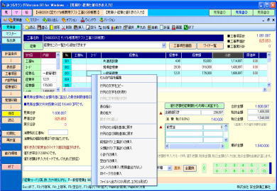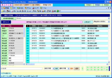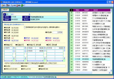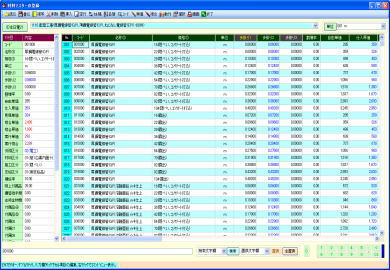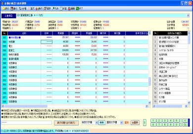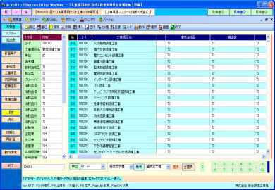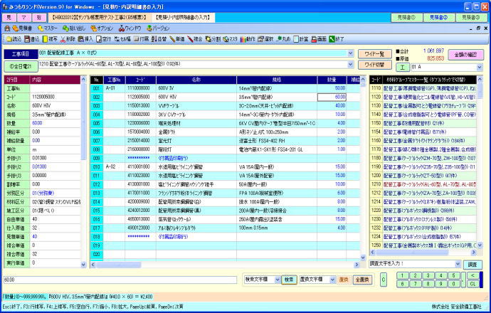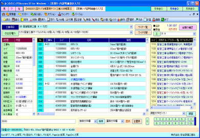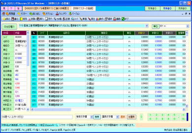 | @内訳明細書の入力作業は、通常の表形式画面と、全項目を固定画面で確認できる、2画面を用意しています。 A表形式画面では、メインとして使用する通常タイプの表と、項目を縦に多く表示確認できるタイプの表の、2種類で処理できます。ダブル表画面では。内容を素早く確認でき、どちらの表でも入力操作が行えます。 ※ダブル表画面は弊社で考案、開発、活用している画期的な処理機能画面です。 B材料マスターの選択一覧はコンパクト表示とワイド表示の2パターンを用意しています。コンパクト表示の場合はメイン画面を広く使え、ワイド表示の場合は材料の検索処理が容易です。表示パターンは切替ボタンでワンタッチ、ワイド一覧の横幅は任意に変更できます。 C単位、工事aA労務区分、支給品区分、複合単価計算式等の項目は一覧リストから選択入力できます。 D数値入力はキーボード入力と、マウスを使用したテンキーボタンと加減算タイプの2種類のボタンを利用できます。 E任意行の複写、削除、挿入。任意行列(セル)のコピー、切り取り、貼り付け操作が行えます。 F付属品や消耗品や労務費の集計金額の印刷行、空白行、コメント行、改ページ行等を任意位置に挿入できます。 G表画面は項目の表示順序、静止行数、静止列数、一行毎の色付け、固定行と固定列のカラー、ENTERキー押下時の一行下の移動先等をユーザーが使い易いようにカスタマイズできます H行の並替え、行の合体、単価の作成、複合の作成、丸め、シュミレーション、画面分割、再計算等は専用画面を表示して解り易く処理できます。 I複数行の特定項目に同じ値を入力できる、列項目の一括セット処理が行えます。 ※その他、積算処理の中核をなす画面として工夫した構成になっています。 |