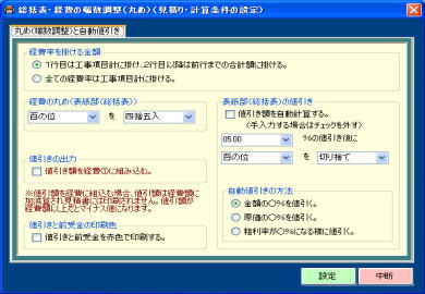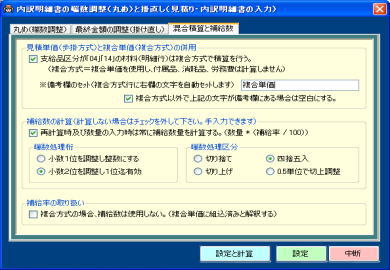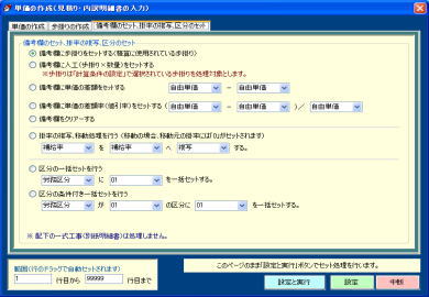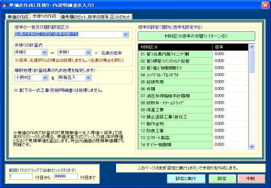 | @桁数はゆとりの20桁。歩掛り、人工、単価、2つの単価の差額、2つの単価の差額率(値引率)等を範囲指定して一括セットできます。 A混合積算時に複合処理した行の備考欄に「複合処理」「複合単価」等の文字を自動セットし判別を容易にします。 B備考欄の一括クリアー処理も行えます。 C見積書印刷時に備考欄が不要な場合は印刷不可の指定も行えます。w刀A工事w刀A消費税についても同様に設定できます。 |