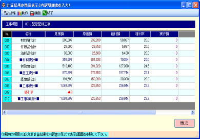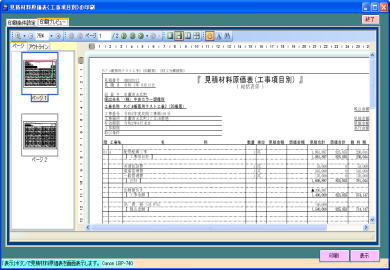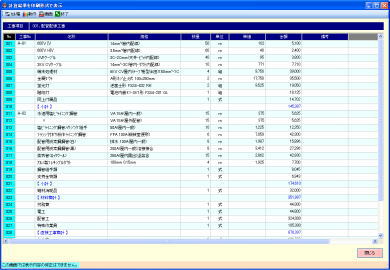 | @内訳明細書の作成中に金額の集計結果(材料費計、同上付属品計、雑材消耗品計、労務費計、経費計、総合計)または印刷結果(帳票への出力イメージ)を画面表示します。 A金額の確認やシュミレーション、同上付属品、雑材消耗品、労務費の印刷位置と金額が詳細に確認できます。空白行やコメント行、支給品行の確認にも便利です。 |