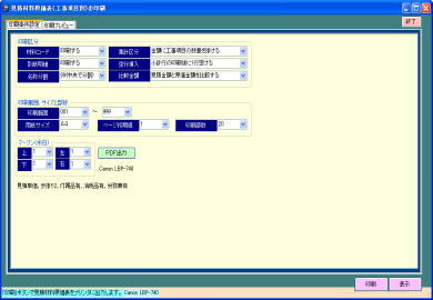 | @原価表や工数表など約20種類の豊富な管理帳票を用意しています。 A見積金額(資材単価、複合単価)、原価、実行単価等を比較検討できます。 A用紙サイズは基本的にA4、B4、A3から選択。工事項目の数量分の加算値有無、小計行後の空白行印字など見易く出力指示出来ます。 C帳票の種類は「みつもりランド8の基本仕様」ページにてご確認下さい。 |
