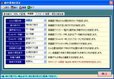 | @基本動作に関するコマンドボタンのサイズ、バックアップ有無、自動マスター、再計算常時実行区分等の機能を設定できます。 A材料や内訳書に関する歩掛りの桁数、単価の大小チェック、マイナス入力、一式工事の有無、有効マスター数等を設定できます。 B表画面に関するカラー、一行毎の色付け、現在セルの形状、フォント情報、ENTERキー扱い、戻す処理、一括修正等を設定できます。 C入力モード、帳票に関する上書入力区分、数値ボックスの有無、破線の種類、太線と細線のサイズ、PAGE配置等を設定できます。 Dその他ユーザーにて調整できる機能を搭載しています。 |